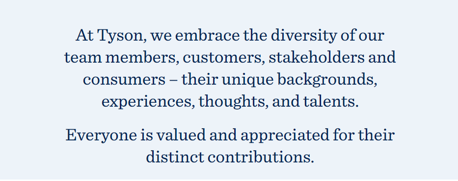 A competitive advantage starts with diverse people. Every role is valuable in contributing to Tyson Foods' purpose of making great food and making a difference. Our diversity, equity, and inclusion efforts focus on ensuring that we recruit, develop, and retain a diverse group of team members, and ensure that all team members have an opportunity to grow and develop personally and professionally.